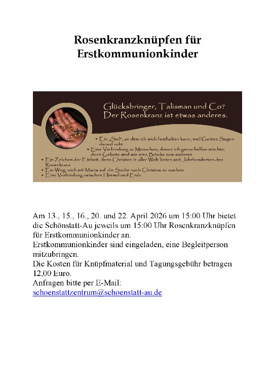 Im Jahr 2026 findet zu verschiedenen Terminen in der Marienkapelle der Schönstatt-Au um 19 Uhr ein Lichter-Rosenkranz statt. Beim Lichter-Rosenkranz ist aus Lichtgläsern ein Rosenkranz gestellt. Die Besucher beten den Rosenkranz für jedes Anliegen, das mitgebracht wird, ob laut gesagt oder unausgesprochen. Für jedes Gebetsanliegen wird ein Licht entzündet. So entsteht während des Betens ein leuchtender Rosenkranz. Wer Gebetsanliegen hat und verhindert ist zu kommen, kann diese an die Schönstatt-Au unter der Rufnummer 02861/923-0 weitergeben